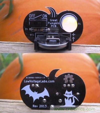 這是low voltage labs開發(fā)的南瓜PCB,除了形狀很可愛,還印了可愛的圖案;這款電路板上面有LED燈泡,就是讓你在萬圣節(jié)放進(jìn)南瓜燈,不必?fù)?dān)心蠟燭會(huì)被風(fēng)吹熄….其實(shí)直接當(dāng)成擺飾也很有味道,而且只要6美元就買得到!