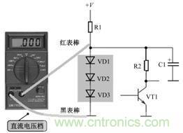 檢測這一電路中的3只二極管最為有效的方法是測量二極管上的直流電壓,如圖所示是測量時接線示意圖。如果測量直流電壓結果是1.8V左右,說明3只二極管工作正常;如果測量直流電壓結果是0V,要測量直流工作電壓+V是否正常和電阻R1是否開路,與3只二極管無關,因為3只二極管同時擊穿的可能性較?。蝗绻麥y量直流電壓結果大于1.8V,檢查3只二極管中有一只開路故障。