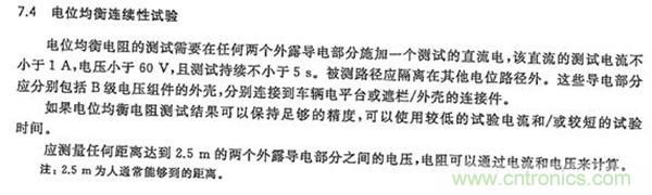 ③ISO 6469-3 Electrically propelled road vehicles-Safety specification-Part3:Protection of persons against electric shock GB/T 18384-3對等電位連接的設計要求、測試要求在標準6.3.1和6.9中做了明確規(guī)定。