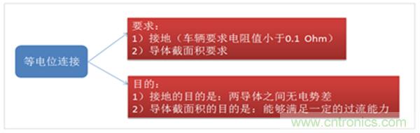 在電動汽車產品中,如果整個電池組的最大電壓超過60V(DC),就已經超過了人體安全電壓的范圍,必須進行等電位連接,以確保使用安全。