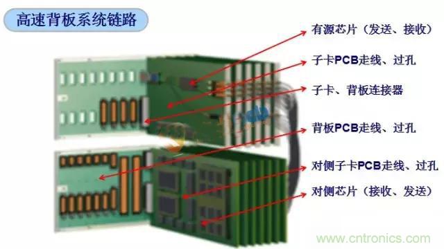 高速背板的設(shè)計除了關(guān)注背板PCBA設(shè)計要素以外,需要關(guān)注整個系統(tǒng)高速信號互連鏈路的設(shè)計,典型的高速信號鏈路參考下圖: