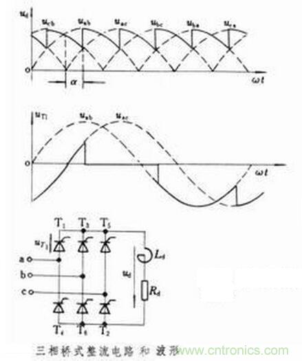 采用三相全控橋式整流電路時(shí),輸出電壓交變分量的最低頻率是電網(wǎng)頻率的6倍,交流分量與直流分量之比也較小,因此濾波器的電感量比同容量的單相或三相半波電路小得多。另外,晶閘管的額定電壓值也較低。因此,這種電路適用于大功率變流裝置。
