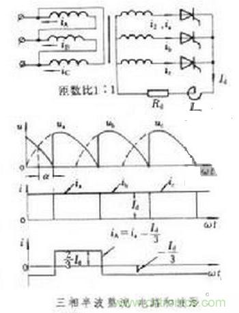 由圖可見(jiàn),變壓器次級(jí)繞組電流i2可以分解成直流分量i2=和交流分量i。由于直流分量i2≈只能產(chǎn)生直流磁通勢(shì),所以它無(wú)法影響初級(jí)電流作相應(yīng)變化。而交流分量 i將通過(guò)變壓器的磁耦合反映到初級(jí)電流中去。這樣,初、次級(jí)電流有效值分別為I1=Id/3、I2=Id/。在α=0°和不考慮電網(wǎng)電壓波動(dòng)等情況下,得S2=1.48Pd、S1=1.21Pd、S=1.345Pd, 其中Pd為整流功率。在三相橋式電路中,次級(jí)無(wú)直流分量電流,所以初、次級(jí)電流是波形相同的交流電,故S=1.05Pd,可見(jiàn)橋式接線時(shí)變壓器利用率提高。