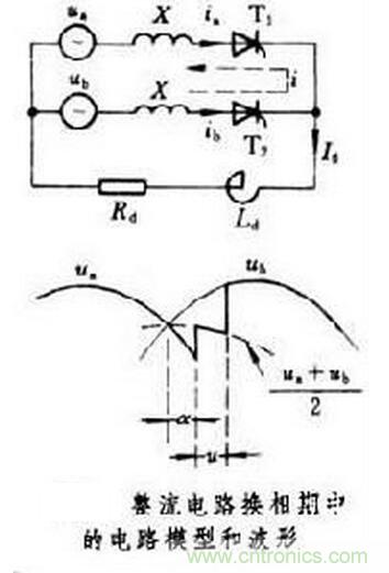 ③重疊導(dǎo)電現(xiàn)象和電壓降:圖5所示為變壓器漏抗存在時(shí)對(duì)整流電路波形的影響。當(dāng)T1處于導(dǎo)通狀態(tài),給直流側(cè)提供電流Id時(shí),觸發(fā)T2,若ud<ub,則T2變?yōu)閷?dǎo)通狀態(tài)。但由于交流側(cè)存在漏感,T2中的電流并不立即變?yōu)镮d,T1中的電流也不立即降為零,因此出現(xiàn)T1和T2同時(shí)導(dǎo)通的狀態(tài),這種狀態(tài)稱為換相重疊現(xiàn)象,這段時(shí)間以相角計(jì)算,稱換相重疊角,用u表示。在重疊期中,輸出電壓為(ud+ub)/2,與不考慮漏抗時(shí)相比,輸出電壓降低了(ub-ud)/2。重疊期內(nèi)直流電流一定的話,則T1、T2回路中流過(guò)環(huán)流i,這時(shí)α相電流id=Id-i將逐漸減小,而b相電流ib=i,當(dāng)ib增加到Id時(shí),id就等于零,這樣就完成了換相過(guò)程。關(guān)于電流i,2&TImes;di/dθ=ub-ud式成立,由于在控制角α處i=0,在(α+u)處i=Id,故有2&TImes;Id=(ub-ud)·u。因此,交流電流在一周期內(nèi)換相一次引起的平均輸出電壓降為dx=XId/2π。重疊角u隨α不同而不同,但電壓降是與α無(wú)關(guān)的常數(shù)。在三相橋式電路中,由于一周內(nèi)換相6次,換相壓降nx=6XId/2π,式中X是每相的電抗。
