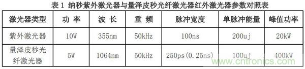 皮秒光纖激光器是在超快激光基礎(chǔ)上開發(fā)出的新一代激光器,尤其是近年來光纖器的研制成功,標(biāo)志著激光技術(shù)的一次飛躍進(jìn)步,與固體納秒激光相比,皮秒光纖激光器具有以下優(yōu)點:1.激光脈沖寬度更窄,僅為 10^-12S,從上述材料吸收激光能量轉(zhuǎn)化為熱能的擴(kuò)散距離公式可知,這將大大減小激光加工材料時的熱擴(kuò)散距離,降低激光對材料的熱損傷;2.因脈沖寬度變窄,激光單脈沖峰值功率成倍增加,提升了激光加工材料的能力;3.光纖激光器以細(xì)小的光纖作為激光的傳輸和放大介質(zhì),與固體放大結(jié)構(gòu)相比,不僅工作穩(wěn)定,免除了周期性的調(diào)校工作,降低了維護(hù)成本,而且結(jié)構(gòu)小巧,制造成本相對較低。表1是量澤激光公司研制的光纖器與目前市面上主流的納秒級固體紫外激光器的參數(shù)對照: