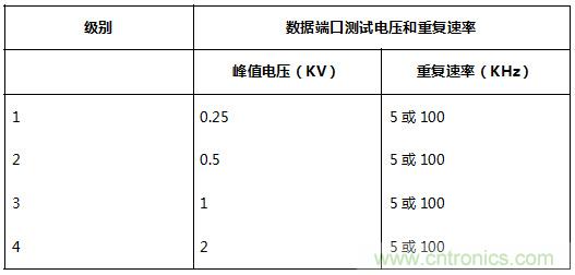 IEC 61000-4-4規(guī)定了不同環(huán)境狀況下的電壓測試級(jí)別,分為4級(jí)。同時(shí)規(guī)定了不同測試級(jí)別對應(yīng)的測試電壓和脈沖重復(fù)速率。