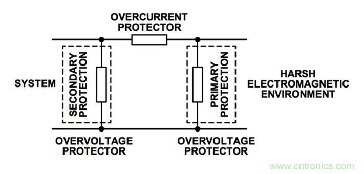 所有上述三個(gè)元件協(xié)同工作,與系統(tǒng)輸入/輸出配 合,一起針對高電壓大電流瞬變?yōu)橄到y(tǒng)提供系統(tǒng)級(jí)保護(hù)。