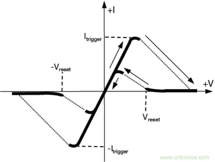 TISP的非線性電壓-電流特性通過轉(zhuǎn)移產(chǎn)生的電流來限制過壓。作為晶閘管,TISP具有非連續(xù)電壓-電流特性,它是由于高電壓區(qū)和低電壓區(qū)之間的切換動(dòng)作而導(dǎo)致的。在TISP器件切換到低電壓狀態(tài)之前,它具有低阻抗接地路徑以分流瞬變能量,雪崩擊穿區(qū)域則導(dǎo)致了箝位動(dòng)作。
