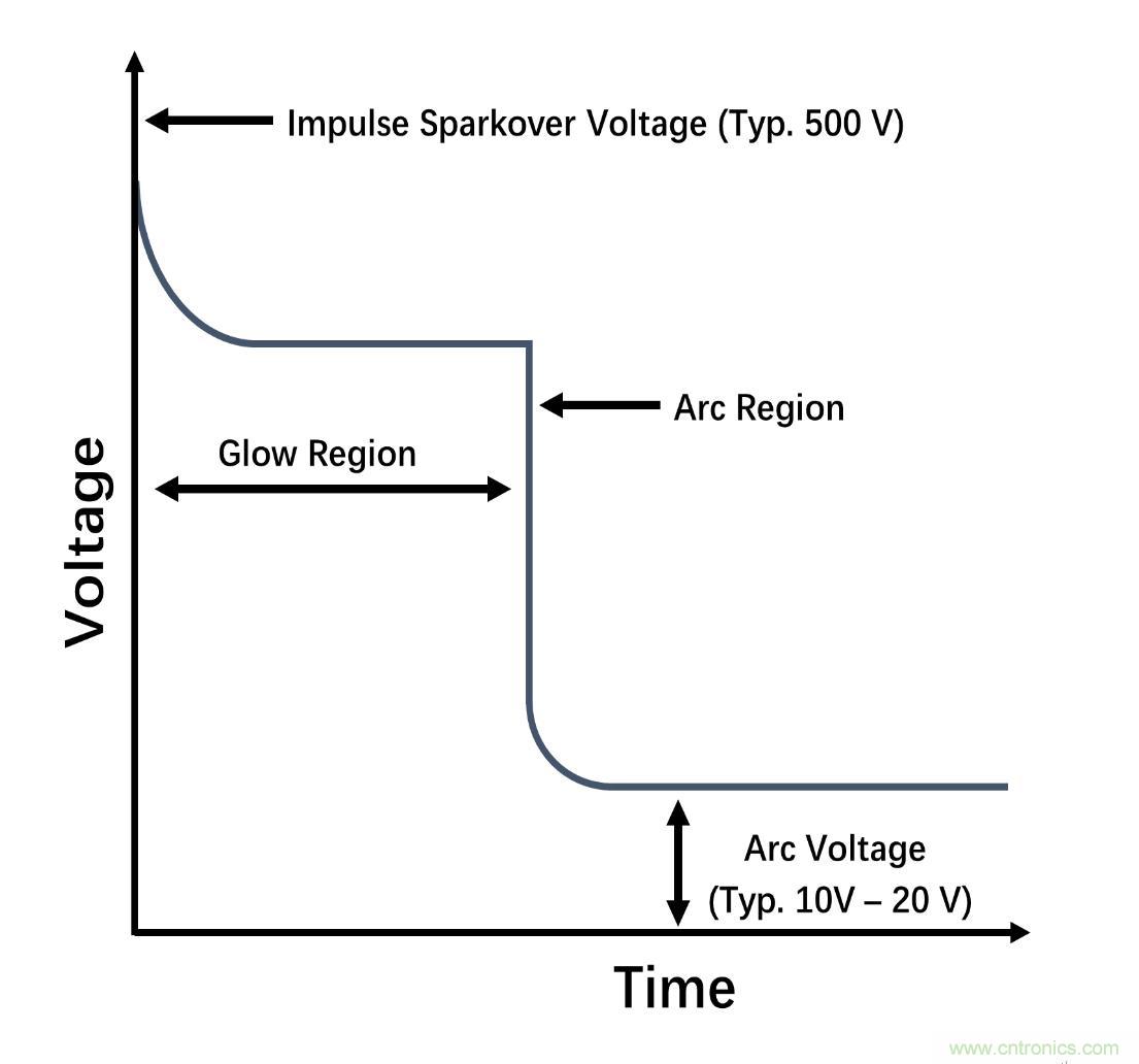 GDT主要用作主保護(hù)器件,提供低阻抗接地路徑以防止過壓瞬變。當(dāng)瞬變電壓達(dá)到GDT火花放電電壓時(shí),GDT將從高阻抗關(guān)閉狀態(tài)切換到電弧模式。在電弧模式下,GDT成為虛擬短路,提供瞬變開路電流接地泄放路徑,將瞬變沖擊電流從受保護(hù)器件上轉(zhuǎn)移開。