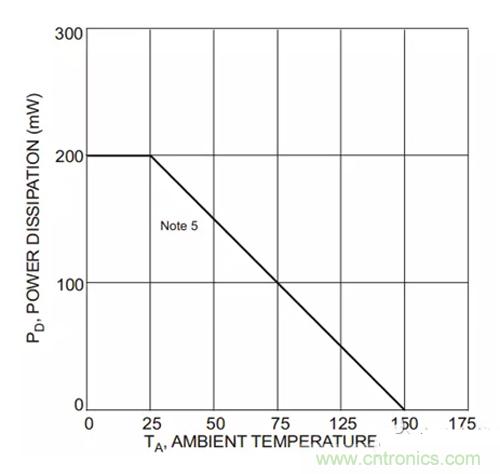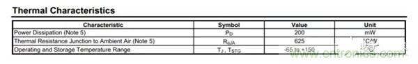 從中可知,其耗散功率PD=200mW,熱阻為625℃/W,其中這兩個量是環(huán)境溫度25℃,焊在FR-4材質(zhì) PCB條件下測試的,如手冊說明Part mounted on FR-4 PC board with recommended layout 。
