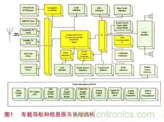 【導(dǎo)讀】在車載電子系統(tǒng)中,信息娛樂(Infotainment)系統(tǒng)是發(fā)展最為迅速的部分,它主要可分為三大類:音頻(CD)、視頻(DVD)以及導(dǎo)航和遠(yuǎn)程信息服務(wù)。最新的進(jìn)展已經(jīng)可以將USB、MP3、藍(lán)牙、iPod和杜比帶入車內(nèi)。圖1為新的車載導(dǎo)航娛樂和信息服務(wù)系統(tǒng)的結(jié)構(gòu)圖。