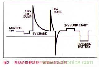 車載環(huán)境中電源電路中的瞬間過壓包括:負(fù)載突降(Load Dump)、跳變開始(Jump Start)以及各種各樣的電壓噪聲。如圖2所示。其中拋負(fù)載過壓是車載環(huán)境中最嚴(yán)重的瞬間過壓,在12V車載系統(tǒng)中,其瞬間過壓可達(dá)125V。