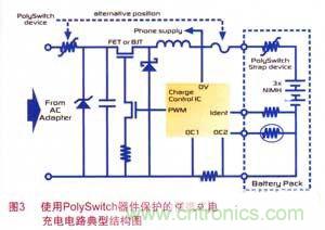 由于PolySwitch器件快速而有效地將過電流限制到安全水平,且體型小巧,可直接貼裝到電路板,因此,可使用該器件對(duì)PND內(nèi)的每條電源電路進(jìn)行一對(duì)一的保護(hù)。圖3為使用了PolySwitch電路保護(hù)器件的便攜式電子設(shè)備中的電池充電電路典型結(jié)構(gòu)圖。PolySwitch和鉗位二極管共同保護(hù)設(shè)備不受過電壓、極性反轉(zhuǎn)等故障的損害,保護(hù)汽車電源及電路不因便攜式電子設(shè)備內(nèi)部故障而損壞。