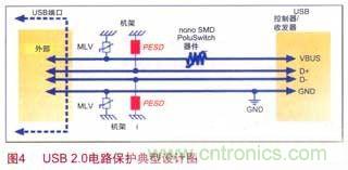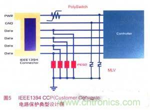 隨著USB/IEEE1394通信速率的增加,電路日趨小型化和敏感化,對(duì)電路瞬態(tài)的保護(hù)就顯得更為重要。每當(dāng)連接和斷開PND,電路都會(huì)受到瞬態(tài)過電壓/過電流的沖擊,故需要在電源和地上分別抑制瞬間過壓。由于鉗位而不會(huì)引起供電中斷,且價(jià)格較低,MLV常被采用。為滿足USB和IEEE1394接口規(guī)范要求,PolySwitch器件通常用于防止USB電源線上因過電流造成的設(shè)備損壞,是即插即用型應(yīng)用設(shè)備的理想選擇。