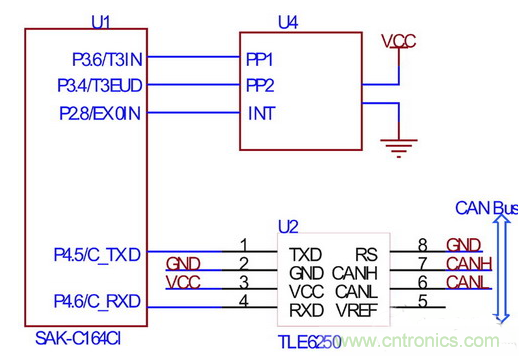 C164CI 與方向盤轉(zhuǎn)角傳感器的接口電路如圖2所示。片內(nèi)內(nèi)置增量編碼的正交解碼器,該解碼器使用定時(shí)器3的兩個(gè)引腳(T3IN、T3EUD)作為正交脈沖的輸入,在正確設(shè)置相關(guān)寄存器后,定時(shí)器3的數(shù)據(jù)寄存器的值與方向盤轉(zhuǎn)角成正比,故可方便的計(jì)算轉(zhuǎn)角,本文所使用的方向盤轉(zhuǎn)角傳感器每一圈對應(yīng)44個(gè)脈沖,設(shè)定時(shí)器3的數(shù)據(jù)寄存器為T3,則絕對轉(zhuǎn)角為。