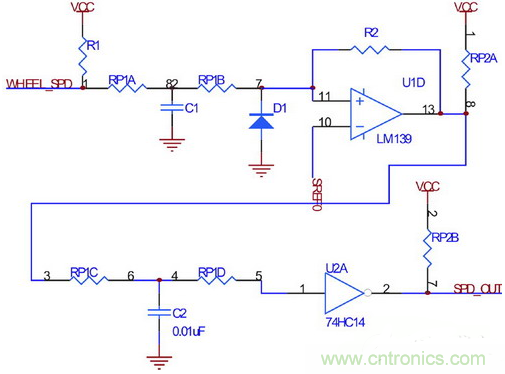 電路采用兩級濾波和整形,以保證輪速信號在極低轉(zhuǎn)速下不會(huì)丟失,同時(shí)避免因懸架振動(dòng)引起的信號干擾。圖中由電阻R2引入第一級遲滯比較,而使用74HC14引入第二級遲滯比較。
