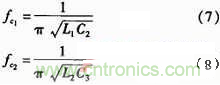 兩個肖特基整流二極管1N5822為續(xù)流二極管,這里為防止產生負電壓,C2、C3、C4、C5、L1、L2組成低通濾波器,其中C5、C6為瓷片電容,C2、C3用電解電容,充放電電流可以流進地,L1、L2為帶鐵芯的電感,帶鐵芯的電感對高頻的抑制比空心電感更好,電感值更高。關于參數(shù)的選取和截止頻率的計算如下