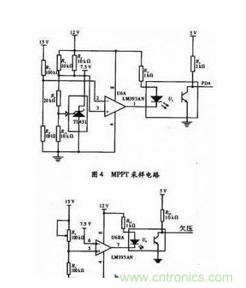 模擬比較器LM393的正相輸入端3腳位固定電壓7.5 V,正常狀態(tài)下PD4采集到的為高電平,當2腳的電壓高于7.5 V時輸出端1腳輸出低電平,光耦導通,PD4采集到的為低電平開始處理SPWM信號調整輸出阻抗來實現(xiàn)恒電壓跟蹤,最終實現(xiàn)最大功率點跟蹤。電路如圖4所示。