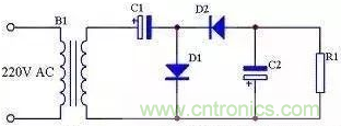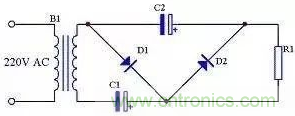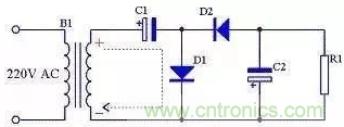 前面介紹的三種整流電路輸出電壓都小于輸入交流電壓的有效值,如果需要輸出電壓大于輸入交流電壓有效值時可以采用倍壓電路,見圖12。由圖13可知,在電源的正半周,變壓器B1次級上端為正下端為負,D1導(dǎo)通,D2截止,C1通過D1充電,充電后C1兩端電壓接近B1次級電壓峰值,方向為左端正右端負;由圖14可知,在電源的負半周,變壓器B1次級上端為負下端為正,D1截止,D2導(dǎo)通,C2通過D1充電,充電后C2兩端電壓接近C1兩端電壓與B1次級電壓峰值之和,方向為下端正上端負。由于負載R1與C1并聯(lián),當R1足夠大時,R1兩端的電壓即為接近2倍B1次級電壓。