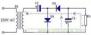 二倍壓整流電路還有另外一種形式的畫法,見圖15,其原理與圖12完全一致,只是表現(xiàn)形式不一樣。