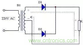 由圖9可以看出在電源正半周時,B1次級上端為正,下端為負,整流二極管D4和D2導(dǎo)通,電流由變壓器B1次級上端經(jīng)過D4、R1、D2回到變壓器B1次級下端;由圖10可以看出在電源負半周時,B1次級下端為正,上端為負,整流二極管D1和D3導(dǎo)通,電流由變壓器B1次級下端經(jīng)過 D1、R1、D3回到變壓器B1次級上端。R1兩端的電壓始終是上正下負,其波形與全波整流時一致。