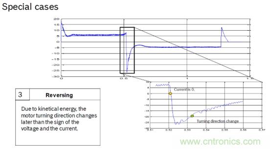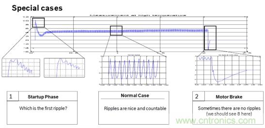 由于電機(jī)在啟動(dòng),停止,反轉(zhuǎn),堵轉(zhuǎn)時(shí)的紋波特征不明顯。如圖5和圖6,不能精準(zhǔn)的計(jì)數(shù)紋波個(gè)數(shù)。只能通過算法進(jìn)行補(bǔ)償。這樣紋波計(jì)數(shù)必然和實(shí)際的必然存在誤差。而這誤差隨著車窗操作次數(shù)的增加,誤差也會(huì)跟著累積。