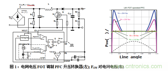 例如,用FOT方法控制CCM PFC前級(jí)升壓穩(wěn)壓器,導(dǎo)致開關(guān)頻率隨電網(wǎng)電壓和負(fù)載條件而發(fā)生明顯變化[1]。按照實(shí)時(shí)電網(wǎng)電壓調(diào)制關(guān)斷時(shí)間,可以降低開關(guān)頻率(TOFFKt Vin, pksinθ), 如圖1所示,只要升壓級(jí)是CCM模式,最終開關(guān)頻率是恒定的[2],如圖1右圖所示。