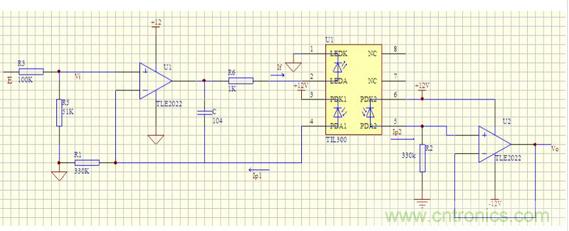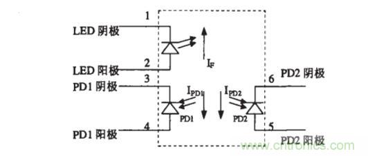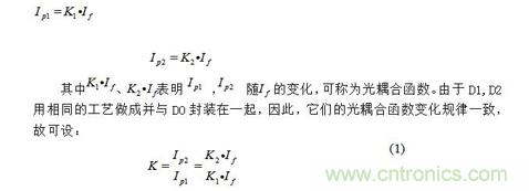 電容C防止電路產(chǎn)生震蕩。TIL300內(nèi)部DO是發(fā)光二極管,其工作電流電If可選為10mA。D1,D2為光敏二極管,他們受DO的激發(fā)分別產(chǎn)生電流IP1和Ip2,其大小與If有關(guān):