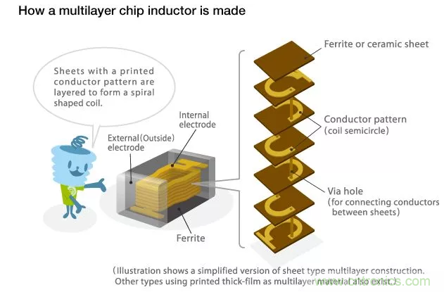 多層片狀電感的制作工藝:將鐵氧體或陶瓷漿料干燥成型,交替印刷導電漿料,最后疊層、燒結成一體化結構(Monolithic)。