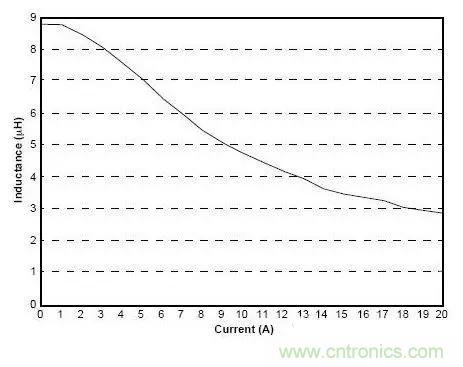 通過已經(jīng)計算的電感峰值電流,我們可以發(fā)現(xiàn)電感上產(chǎn)生了什么。很容易會知道,隨著通過電感的電流增加,它的電感量會減小。這是由于磁芯材料的物理特性決定 的。電感量會減少多少就很重要了:如果電感量減小很多,轉(zhuǎn)換器就不會正常工作了。當通過電感的電流大到電感實效的程度,此時的電流稱為“飽和電流”。這也 是電感的基本參數(shù)。