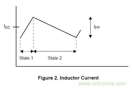 因此,當電感上的電壓為正時(狀態(tài)1),電感上的電流就會增加;當電感上的電壓為負時(狀態(tài)2),電感上的電流就會減小。通過電感的電流如圖2所示: