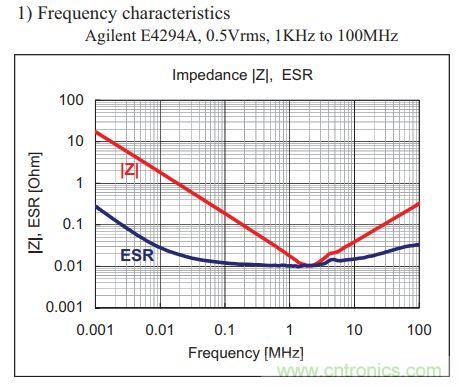 MLCC有經(jīng)典的V型阻抗-頻率曲線。隨著頻率升高,寄生電感的影響開始凸顯,阻抗先變小再變大,這是MLCC的固有特性。曲線中的最低點就是MLCC的自諧振頻率。