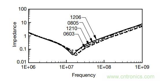 一般來說,直插件的引線較長,其寄生電感比SMD大;電解電容內(nèi)部有大量卷繞結(jié)構(gòu)的鋁箔,寄生電感比其它工藝的電容大。1206尺寸的MLCC內(nèi)部電極面積和焊接端子截面明顯比0805大,所以尺寸越大的MLCC,自諧振頻率就越低。