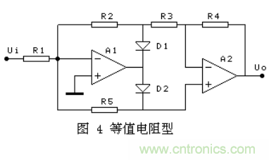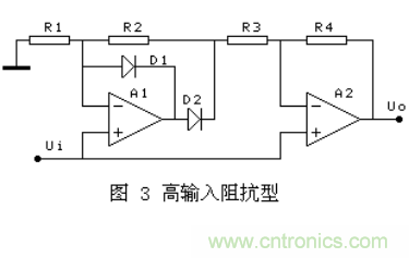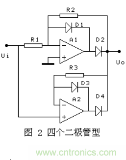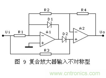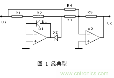 其它幾種,有的在D2導通的半周內(nèi),通過A2的復合實現(xiàn)A1的負反饋,對有些運放會出現(xiàn)自激. 有的兩個半波的輸入阻抗不相等,對信號源要求較高。