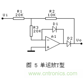 圖5 和 圖6 要求R1=2R2=2R3,增益為1/2,缺點是:當輸入信號正半周時,輸出阻抗比較高,可以在輸出增加增益為2的同相放大器隔離.另外一個缺點是正半周和負半周的輸入阻抗不相等,要求輸入信號的內(nèi)阻忽略不計。