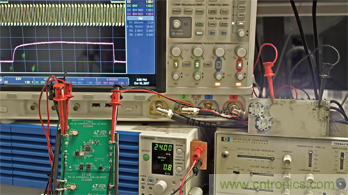 LT3932演示電路(DC2286A)設(shè)計(jì)為通過一個或兩個LED(作為降壓LED驅(qū)動器)驅(qū)動1 A的LED電流。如圖1所示,它很容易進(jìn)行更改和并聯(lián),以實(shí)現(xiàn)更高電流、更高電壓或并聯(lián)運(yùn)行。圖4顯示了如何將兩個這樣的電路輕松連接在一起,從24 V輸入以10μs、3 A脈沖驅(qū)動4個LED。出于測試目的,脈沖發(fā)生器可用于提供同步時(shí)鐘信號,如圖4所示。在量產(chǎn)機(jī)器視覺系統(tǒng)中,可利用時(shí)鐘芯片生成同步時(shí)鐘信號和PWM脈沖。如需更高電流脈沖,可使用相同的并聯(lián)方案添加更多演示電路DC2286A轉(zhuǎn)換器。