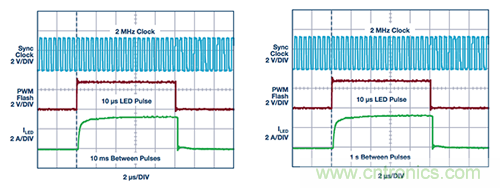 圖2. 無論P(yáng)WM關(guān)斷時(shí)間是多少,圖1所示并聯(lián)LED驅(qū)動器的3 A相機(jī)閃光波形看起來相同。波形顯示,(a) 10 ms之后和(b) 1 s之后的10μs脈沖是相同的。經(jīng)過一天或更長的PWM關(guān)斷時(shí)間之后,LT3932 LED閃光波形看起來也相同。