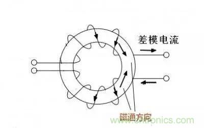 共模電感會飽和嗎?答案是非常難飽和,通常情況下無需擔(dān)心飽和問題,為什么呢?我們先來看看差模電流流過共模電感的情況。如圖,差模電流電流電感時(shí)其磁通是相互抵消的,也就是說,在磁路里基本沒有磁通產(chǎn)生,差模電流流過時(shí)沒有阻力,沒有損耗,簡單說,一個(gè)額定電流5A的共模電感流過100A的差模電流也不會飽和,當(dāng)然前提是導(dǎo)線夠粗。