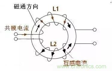 1)L1的磁通會使L2產(chǎn)生互感電動勢,互感電動勢的方向總是要阻礙磁通的增加,于是在L2中產(chǎn)生和共模電流方向相反的電流,L2的共模電流被抵消,反之,L1對L2的互感電流也是與L1的共模電流方向相反,也就是說L1的共模電流被抵消。如下圖所示,L2中的互感電流與L2的共模電流方向相反的: