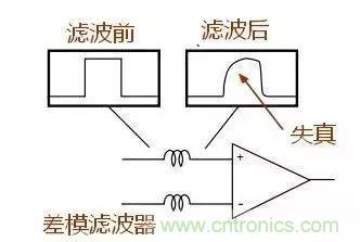 共模濾波器和差模濾波器對差模信號濾波效果對比,差模濾波器在濾出疊加在信號上的噪聲后導(dǎo)致波形失真。