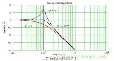 有于濾波電路中有兩個(gè)儲能原件因此是兩階濾波器,這濾波器有個(gè)很大的問題,由于無阻尼,因此當(dāng)干擾信號的頻率達(dá)到濾波器的截止頻率時(shí)(Cut off),干擾信號不但沒有被抑制反而被放大了,如圖所示: