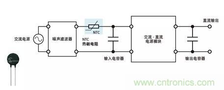 各種電源電路和外圍電路緊湊地集成到一起的內置電源稱為電源模塊。交流-直流電源模塊是由交流-直流整流電路、直流-直流轉換器以及少量外部零部件組成的電源,可以形成一個節(jié)省空間的優(yōu)化電源系統(tǒng)。插入一個NTC熱敏電阻(電源熱敏電阻)可以有效地限制在通電時施加到輸入和輸出電容器上勵磁涌流。