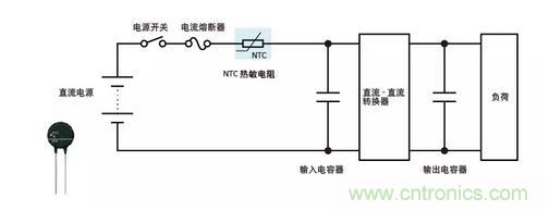 在直流-直流轉換器等的直流電源電路等中,NTC熱敏電阻用作電源熱敏電阻,有效地限制勵磁涌流,輸入和輸出電容器在接通電源時充電。NTC熱敏電阻的電阻在通電后變得非常低,達到比使用固定電阻時更低的功率損耗。