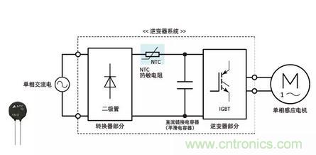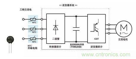 逆變器系統(tǒng)包括轉換器部分、逆變器部分和安裝在轉換器部分之后的直流鏈路電容器(平滑電容器)。啟動時,裝置充電,峰值比穩(wěn)定電流大幾倍的勵磁涌流充滿直流鏈路電容器。這種勵磁涌流可能對直流電容器的使用壽命產(chǎn)生有害影響或破壞半導體器件。為了防止勵磁涌流,所以連接NTC熱敏電阻(電源熱敏電阻)。
