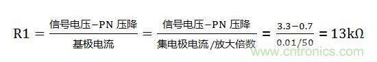 注解:13K為計算出來的最小電阻值,但為了三極管可靠地進入飽和狀態(tài),我們?nèi)≈当M可能比13K要小點。取5.1K,畢竟此時流入基極的電流13K或5.1K都非常小了,對損耗功率可以幾乎不計,因此保險起見取小點電阻值也無防。