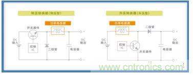由于電源電路的功率電感器中會流過大電流,因此繞組型為主流產(chǎn)品。這是因為,通過將高導磁率的磁性體(鐵氧體或軟磁性金屬)用于磁芯中,以較少巻數(shù)實現(xiàn)高電感值,從而可使產(chǎn)品更為小型化。圖3所示為使用功率電感器的DC-DC轉(zhuǎn)換器(非絕緣型及斬波方式)基本電路。