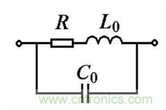 同一個(gè)電阻元件在通以直流和交流電時(shí)測得的電阻值是不相同的。在高頻交流下,須考慮電阻元件的引線電感L0和分布電容C0的影響,其等效電路如圖1所示,圖中R為理想電阻。由圖可知此元件在頻率f下的等效阻抗為