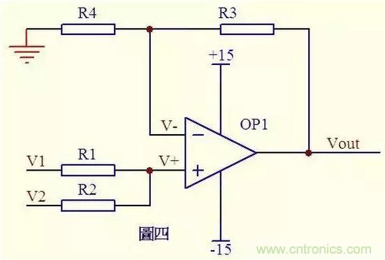 請看圖四。因為虛斷,運放同向端沒有電流流過,則流過R1和R2的電流相等,同理流過R4和R3的電流也相等。故 (V1 – V+)/R1 = (V+ - V2)/R2 ……a (Vout – V-)/R3 = V-/R4 ……b 由虛短知: V+ = V- ……c 如果R1=R2,R3=R4,則由以上式子可以推導(dǎo)出 V+ = (V1 + V2)/2 V- = Vout/2 故 Vout = V1 + V2 也是一個加法器。