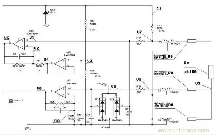 來一個復(fù)雜的,圖十一是一個三線制PT100前置放大電路。PT100傳感器引出三根材質(zhì)、線徑、長度完全相同的線,接法如圖所示。有2V的電壓加在由R14、R20、R15、Z1、PT100及其線電阻組成的橋電路上。Z1、Z2、Z3、D11、D12、D83及各電容在電路中起濾波和保護作用,靜態(tài)分析時可不予理會,Z1、Z2、Z3可視為短路,D11、D12、D83及各電容可視為開路。 由電阻分壓知, V3=2*R20/(R14+20)=200/1100=2/11 ……a 由虛短知,U8B第6、7腳 電壓和第5腳電壓相等 V4=V3 ……b 由虛斷知,U8A第2腳沒有電流流過,則流過R18和R19上的電流相等。 (V2-V4)/R19=(V5-V2)/R18 ……c 由虛斷知,U8A第3腳沒有電流流過, V1=V7 ……d 在橋電路中R15和Z1、PT100及線電阻串聯(lián),PT100與線電阻串聯(lián)分得的電壓通過電阻R17加至U8A的第3腳, V7=2*(Rx+2R0)/(R15+Rx+2R0) …..e 由虛短知,U8A第3腳和第2腳電壓相等, V1=V2 ……f 由abcdef得, (V5-V7)/100=(V7-V3)/2.2 化簡得 V5=(102.2*V7-100V3)/2.2 即 V5=204.4(Rx+2R0)/(1000+Rx+2R0) – 200/11 ……g 上式輸出電壓V5是Rx的函數(shù) 我們再看線電阻的影響。Pt100最下端線電阻上產(chǎn)生的電壓降經(jīng)過中間的線電阻、Z2、R22,加至U8C的第10腳,由虛斷知, V5=V8=V9=2*R0/(R15+Rx+2R0) ……a (V6-V10)/R25=V10/R26 ……b 由虛短知, V10=V5 ……c 由式abc得 V6=(102.2/2.2)V5=204.4R0/[2.2(1000+Rx+2R0)] ……h 由式gh組成的方程組知,如果測出V5、V6的值,就可算出Rx及R0,知道Rx,查pt100分度表就知道溫度的大小了。