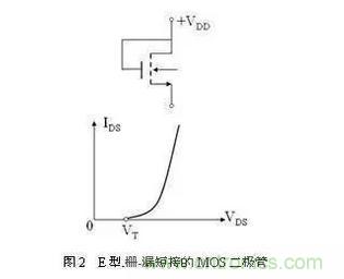 【答】這種集成MOS二極管的連接方式及其伏安特性如圖2所示。因?yàn)闁艠O與漏極短接,則VGS=VDS。因此,當(dāng)電壓較?。╒GS=VDS<VT)時(shí),不會(huì)出現(xiàn)溝道,則器件處于截止?fàn)顟B(tài),輸出電流IDS=0;當(dāng)電壓高于閾值電壓(VGS=VDS≥VT)時(shí),因?yàn)榭倽M(mǎn)足VDS>(VGS-VT)關(guān)系,于是出現(xiàn)了溝道、但總是被夾斷的,所以器件處于飽和狀態(tài),輸出源-漏電流最大、并且飽和,為恒流源。